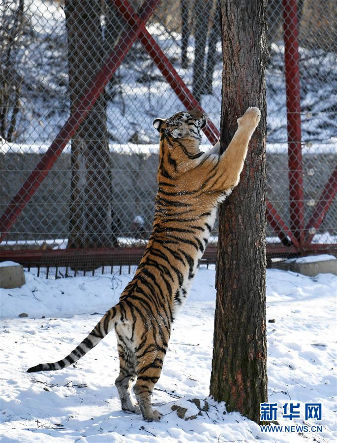 在橫道河子東北虎林園散放區(qū),一只東北虎在練“爪子”(11月21日攝)。新華社記者王建威攝