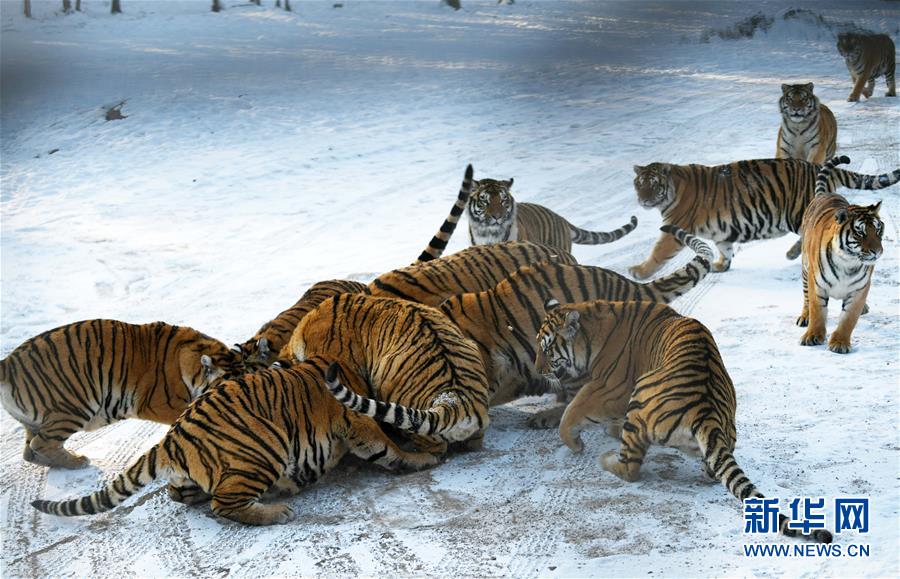 在橫道河子東北虎林園散放區(qū),一群東北虎在搶食投放的活雞(11月21日攝)。新華社記者王建威攝
