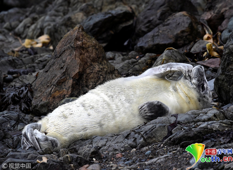 中國青年網北京10月9日電 當地時間2018年10月8日,英國彭布羅克郡,一只大西洋海豹幼崽躺在海邊礁石上。海豹幼崽出生時都有毛茸茸的白色非防水皮毛,它們會在第四周蛻皮。