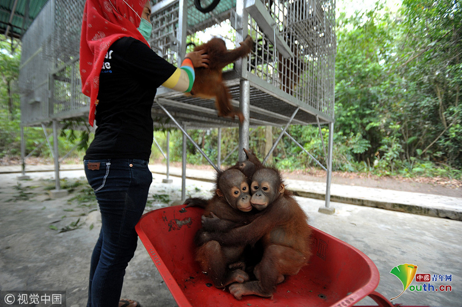 印尼加里曼丹克塔邦,國際動物救援(IAR)猩猩安全與保護中心里,飼養(yǎng)員用獨輪車把猩猩寶寶送到森林學校。圖片作者:Newscom