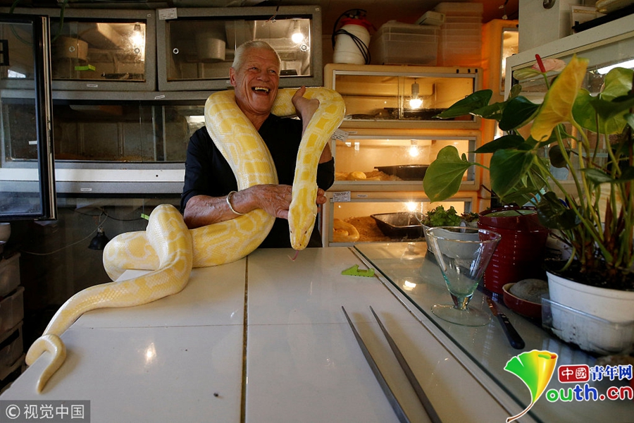 男子與400多只爬行動物生活在一起