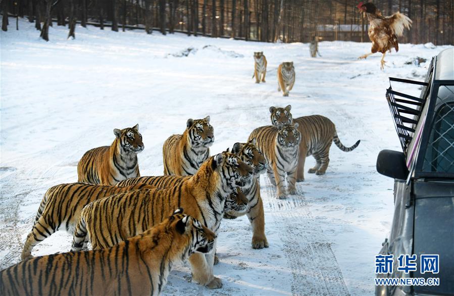 在橫道河子東北虎林園散放區(qū),一群東北虎準備捕食投放的活雞(11月21日攝)。新華社記者王建威攝