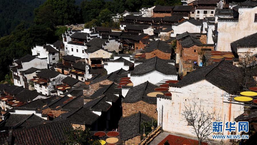 2017年10月26日拍攝的篁嶺古村。家家戶戶晾曬各種蔬果及皇菊。近日天氣晴朗,江西省婺源縣江灣鎮(zhèn)篁嶺村村民抓住時機采摘、晾曬皇菊及蔬果。明黃的菊花、火紅的辣椒……各種顏色將篁嶺古村裝扮成巨大的“調色板”,引來眾多游客感受鄉(xiāng)村美景。新華社記者宋振平 攝