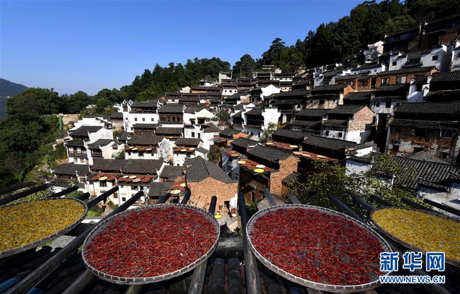 2017年10月26日拍攝的篁嶺古村。家家戶戶晾曬各種蔬果及皇菊。近日天氣晴朗,江西省婺源縣江灣鎮(zhèn)篁嶺村村民抓住時機(jī)采摘、晾曬皇菊及蔬果。明黃的菊花、火紅的辣椒……各種顏色將篁嶺古村裝扮成巨大的“調(diào)色板”,引來眾多游客感受鄉(xiāng)村美景。新華社記者宋振平 攝