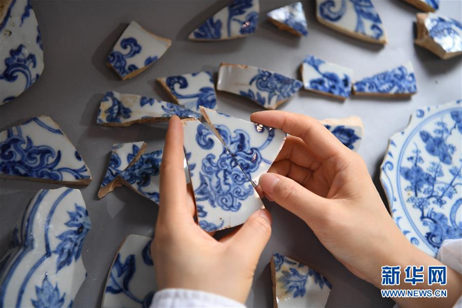在江西景德鎮(zhèn)御窯廠遺址,工作人員正在修復(fù)明代瓷枕(9月20日攝)。 新華社記者 萬象 攝