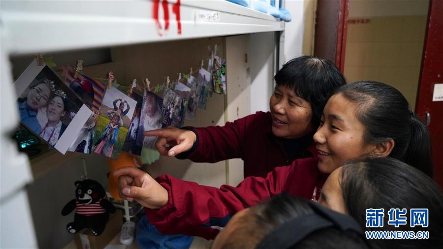 11月16日,南昌市第十七中學(xué)西藏班的學(xué)生通過照片給“愛心媽媽”劉和平(左一)介紹家中情況。新華社記者 胡晨歡 攝