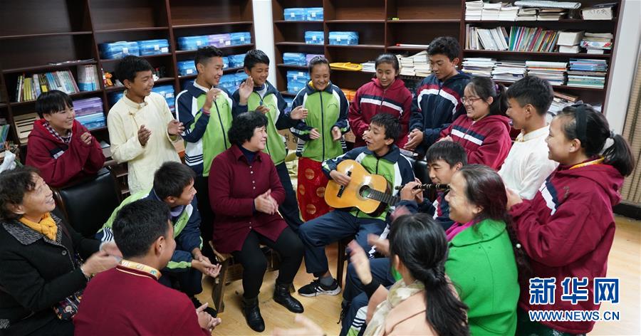 11月16日,南昌市第十七中學(xué)西藏班的學(xué)生為劉和平(中間紅衣者)及“愛心媽媽志愿服務(wù)團”成員表演彈唱。新華社記者 胡晨歡 攝