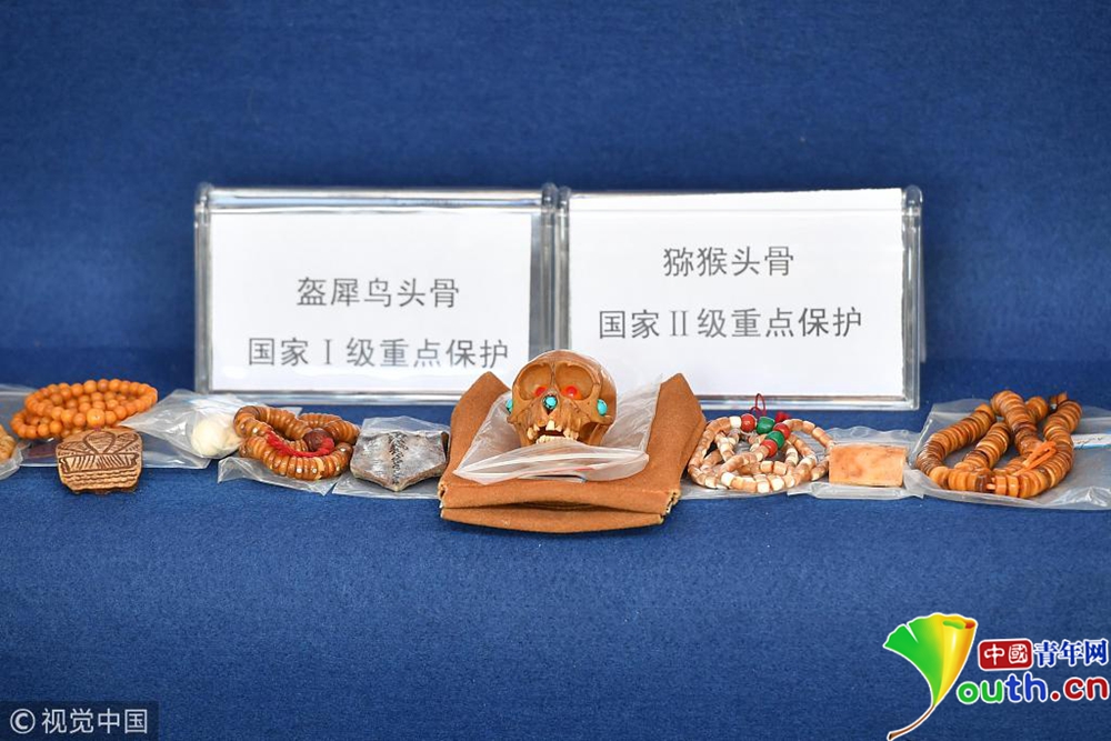 警方查獲的獼猴和盔犀鳥(niǎo)頭骨制品。