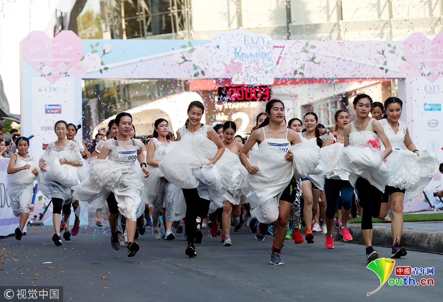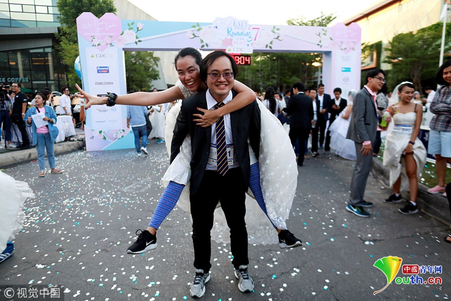 當(dāng)?shù)貢r(shí)間2018年11月24日,泰國(guó)曼谷舉辦新娘賽跑活動(dòng),獲勝者將獲得婚禮的全額資助,眾多新娘在街頭提裙狂奔。情侶沖過終點(diǎn)合影。