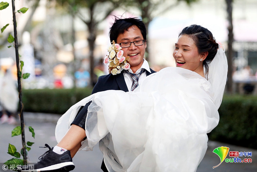 當(dāng)?shù)貢r(shí)間2018年11月24日,泰國(guó)曼谷舉辦新娘賽跑活動(dòng),獲勝者將獲得婚禮的全額資助,眾多新娘在街頭提裙狂奔。圖為甜蜜合影。