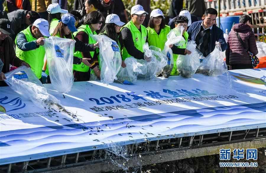 11月23日,志愿者們在滇池湖畔放魚。新華社記者江文耀攝