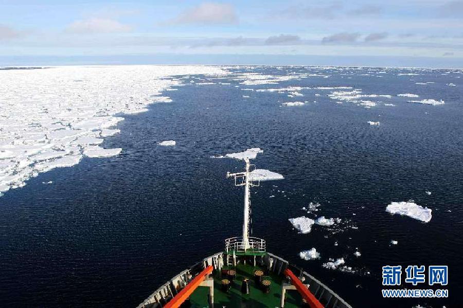 從“雪龍”號(hào)駕駛臺(tái)上放眼望去,浮冰鋪滿(mǎn)海面,時(shí)有冰山立于其間?!把垺碧?hào)沿著浮冰間的空隙行進(jìn),碾過(guò)浮冰的撞擊聲不時(shí)從船底傳來(lái)。為減輕船體的震動(dòng),航速有所下降,由原來(lái)的每小時(shí)15節(jié)左右降為目前的每小時(shí)9節(jié)左右(1節(jié)約合每小時(shí)航行1.852公里)。