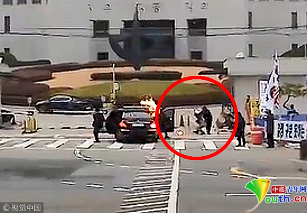 當?shù)貢r間2018年11月27日,韓國首爾,27日上午9點10分,在首爾瑞草區(qū)的最高法院前面,一名74歲的示威男子向韓國最高法院院長金明秀所乘的車輛投擲燃燒瓶。副駕駛一側的前輪和示威男子身上均起火,所幸被現(xiàn)場警察迅速撲滅,金明秀未受傷。當時,他正準備去上班。
