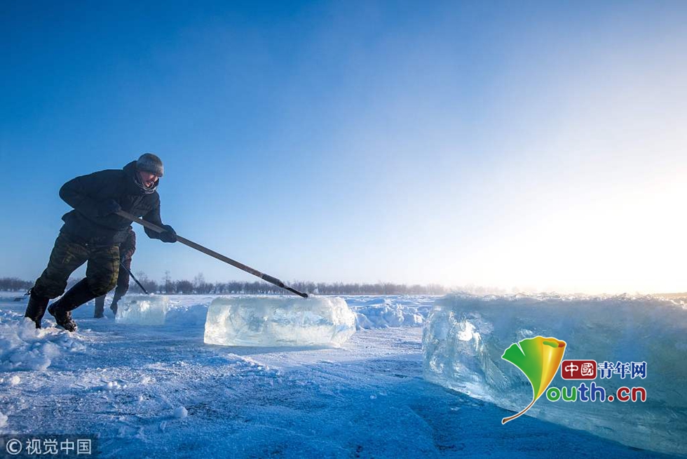 當?shù)貢r間2018年11月27日,雅庫茨克,零下41攝氏度左右的氣溫下,村民在當?shù)氐囊粋€湖中采集冰塊。當?shù)睾芏嗳艘蕾囉谌诨鶋K解決供水,因為多年凍土覆蓋地區(qū)冬季氣溫極低,沒有其他的方式供應水。
