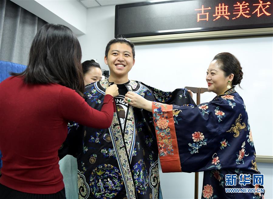 11月30日,在北京服裝學(xué)院,在畢紅(右)的邀請(qǐng)下,一名大學(xué)生試穿清代團(tuán)花刺繡服裝。 新華社記者李賀攝