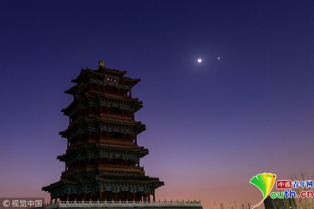 2018年12月4日,北京,金星合月天象。金星位于月亮以南3.6度左右的位置上。在這個時間附近,以肉眼從地面看去,金星與月亮的二維距離在夜空中看起來是比較接近的,但是在三維空間上,它們的距離是非常遙遠(yuǎn)的(大約6000萬千米)。圖片來源:視覺中國