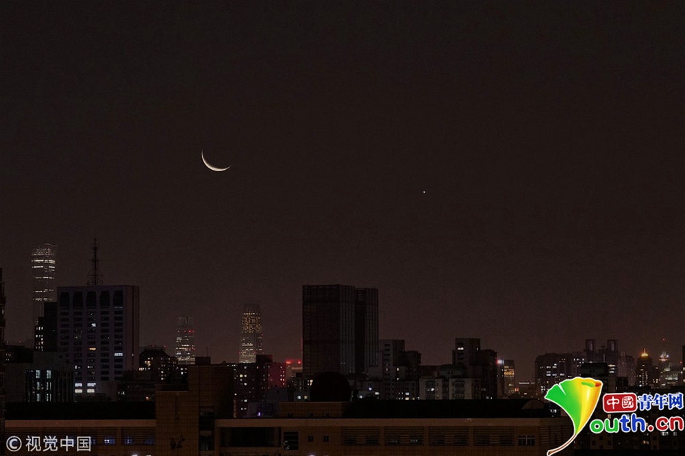 北京,天宇上演“金星合月”,清晨5點時,東南方低空出現(xiàn)一顆明亮的金星和一彎窄月近距離相依相伴的美麗畫面。