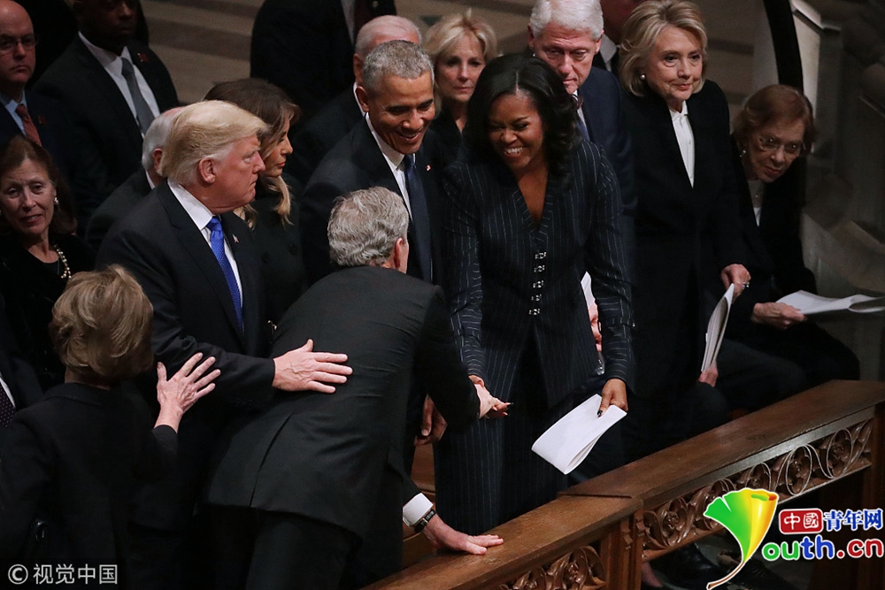 布什家族成員、現(xiàn)任總統(tǒng)特朗普、前總統(tǒng)奧巴馬等美國政界人士以及多名國際政要出席,為老布什送行。