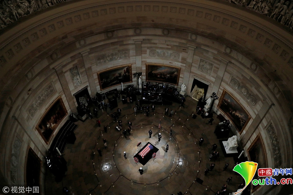 美國前總統(tǒng)老布什的遺體3日下午運抵首都華盛頓,安放在國會大廈圓頂大廳,接受吊唁。