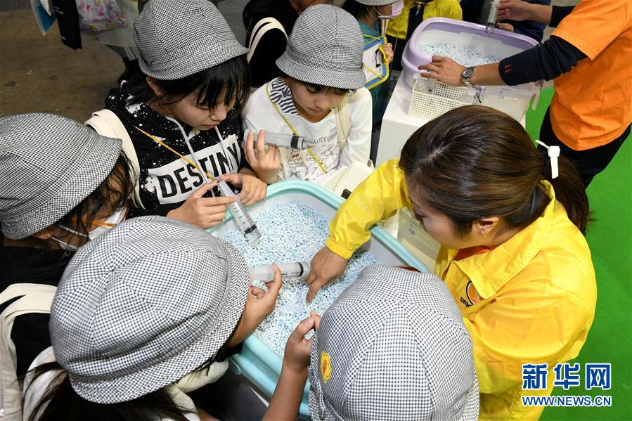 12月6日,在日本東京,小學(xué)生們參觀一種環(huán)保寵物用品。這種利用產(chǎn)業(yè)廢料制成的顆粒狀材料可以吸收寵物尿液并凝聚成團(tuán),方便清理。