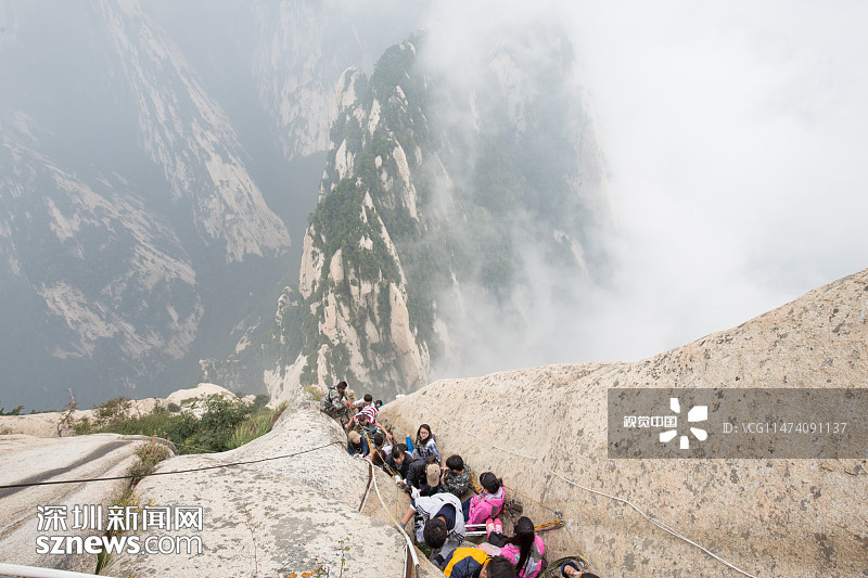 2015年09月18日,陜西渭南,西岳華山歷來被認為是五岳之中最為險峻的,而在華山中,險中之險莫過于“長空棧道”和“鷂子翻身”。華山長空棧道位于華山南峰東側山腰,是一條具有七百多年歷史的古棧道。棧道上下皆是懸崖絕壁由30多厘米寬的木板和條石搭成,下面是萬丈深淵,僅靠一條鐵索作為抓手,被喻為“華山第一天險”。