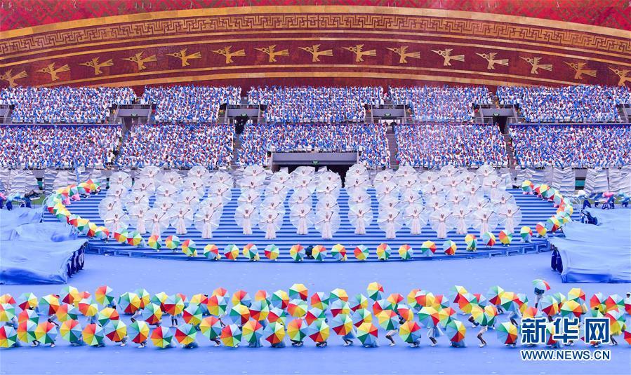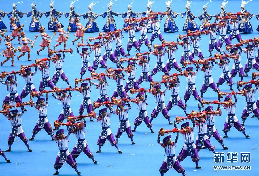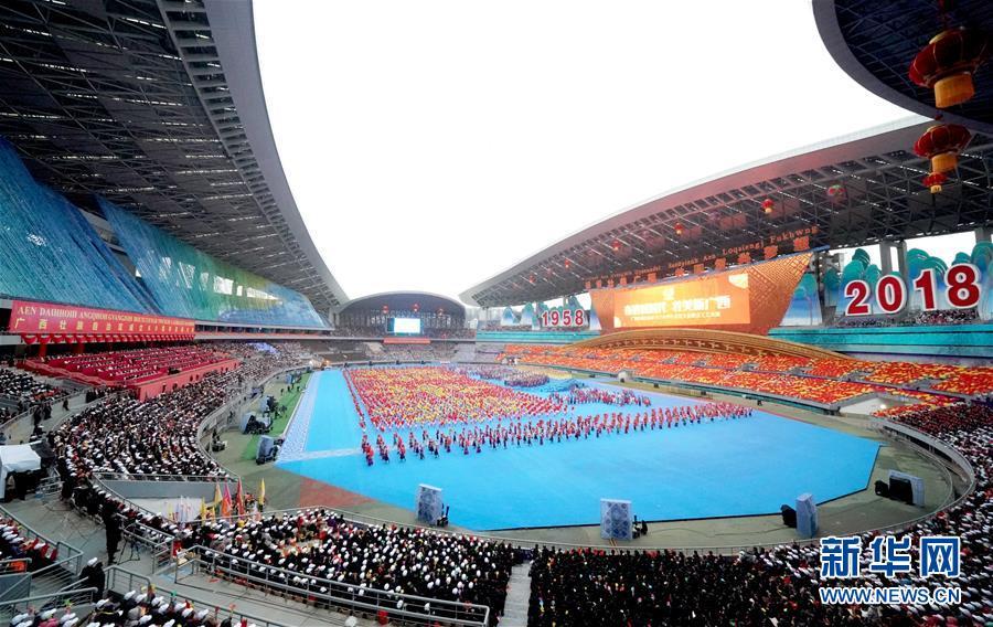 12月10日,廣西壯族自治區(qū)成立60周年慶祝大會(huì)在廣西體育中心隆重舉行。這是慶祝大會(huì)上的群眾文藝表演。 新華社記者 李鑫 攝