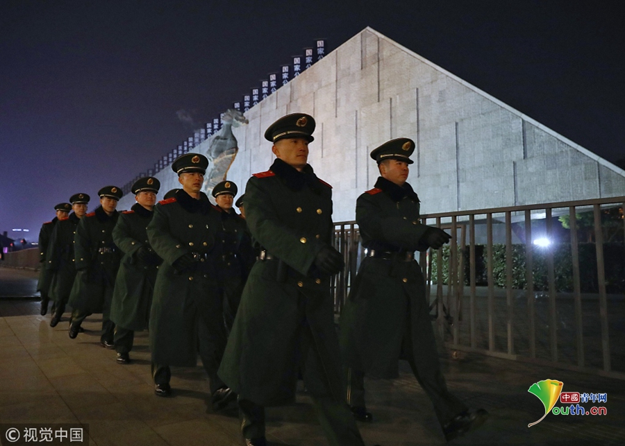 2018年12月12日晚,江蘇南京,侵華日軍南京大屠殺遇難同胞紀念館沿線道路莊嚴肅穆、安保和工作人員做好了準備,迎接第五個南京大屠殺死難者國家公祭日。2018年是南京大屠殺慘案發(fā)生81周年,第五個南京大屠殺死難者國家公祭儀式將于12月13日舉行。圖片作者:尼克