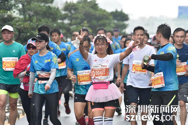 2018年12月16日,深圳國(guó)際馬拉松位于后海的折返點(diǎn),一名選手正在向終點(diǎn)沖刺,并向鏡頭招手。