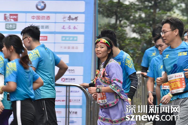 2018年12月16日,深圳國際馬拉松位于后海的折返點,一名身著民族傳統(tǒng)服裝的選手正在向終點沖刺。