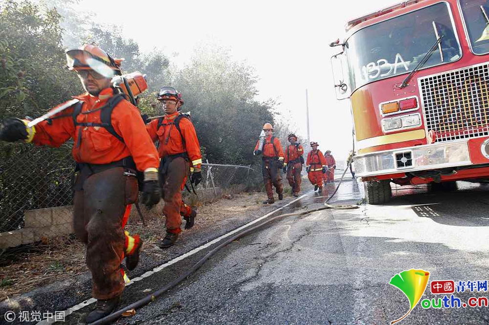 該郡第二大城市千橡樹市(Thousand Oaks)等很多地方房屋被毀,高速公路封閉,居民緊急疏散。洛杉磯郡圣蓋博市(San Gabriel)警察局警官日瓦戈(O. Zhivaga)和同事們當天清晨即受命馳援文圖拉郡,保護當?shù)鼐用窈拓敭a(chǎn)安全。圖為消防車行駛在已封閉的公路上,天空中濃煙滾滾。