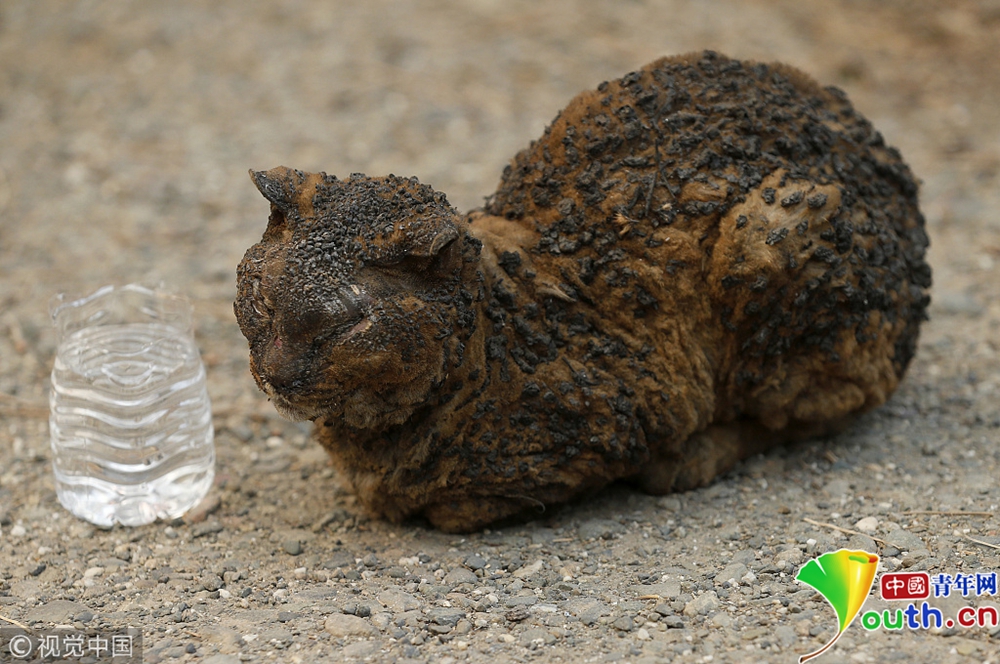 這場美國史上最嚴重山火導致7700多所房屋被毀,5萬多人流離失所。一只被燒傷的貓在等待動物管理局到來救助。