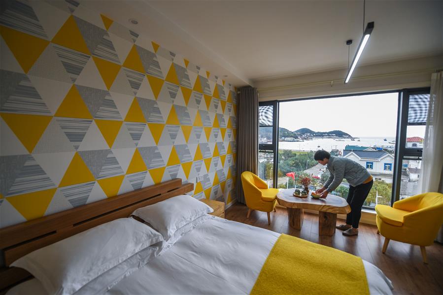 12月16日,“迷嶼?!泵袼夼魅藦堒坝柙诿袼薮筇妹β?。該民宿臨海而建,環(huán)境優(yōu)美,吸引很多游客前來休閑住宿。 新華社記者 徐昱 攝