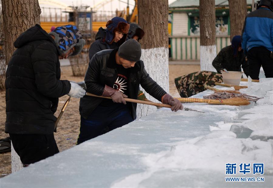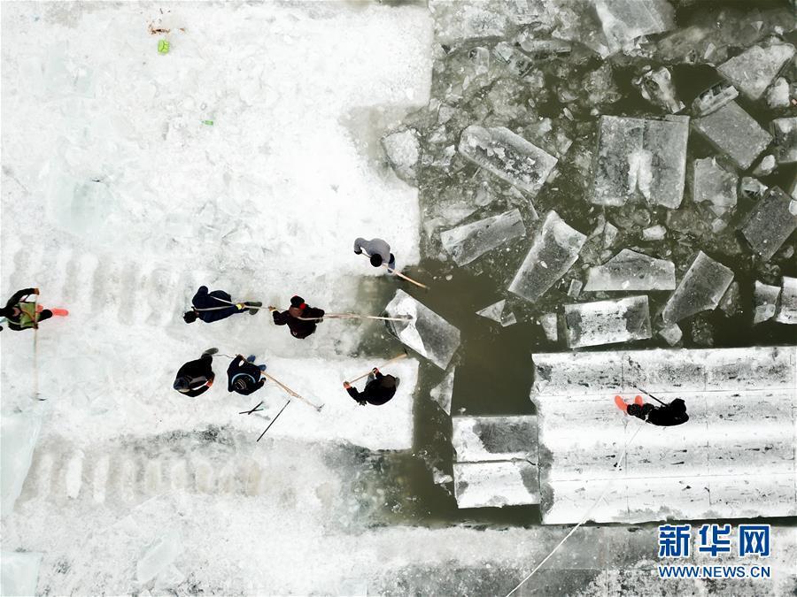 12月17日,工人們在松花江畔收集雪塊,準(zhǔn)備制作雪雕作品。新華社記者王凱攝