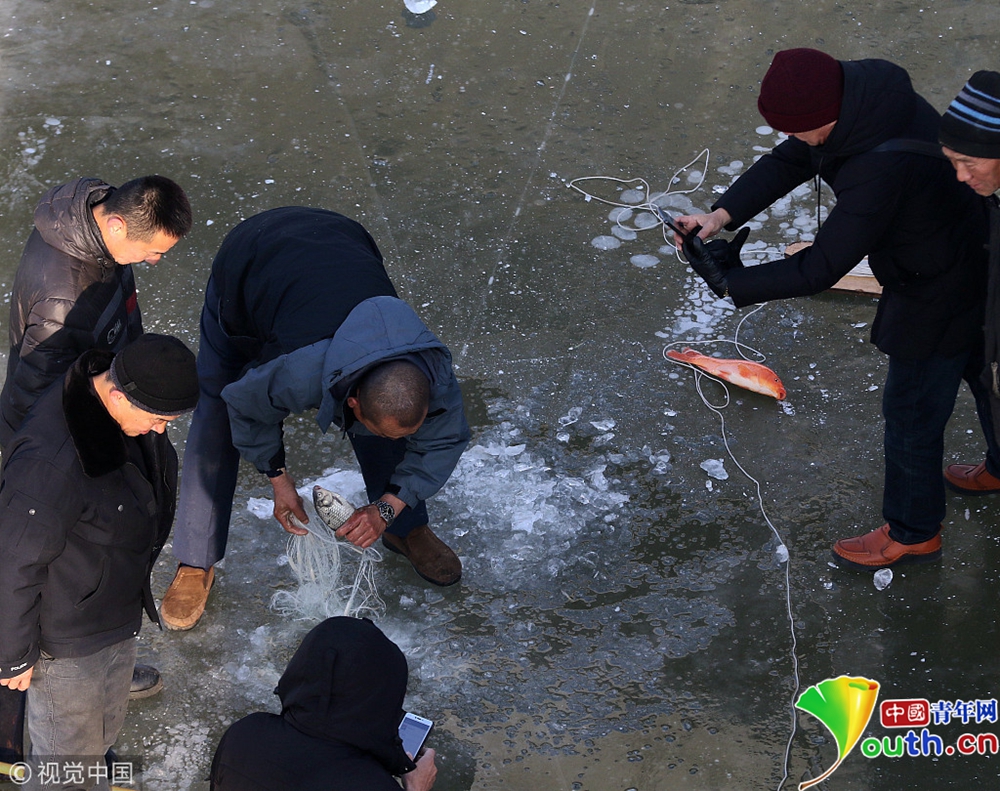 民眾鑿冰下網(wǎng)捕魚。