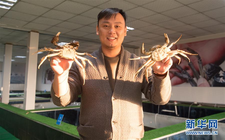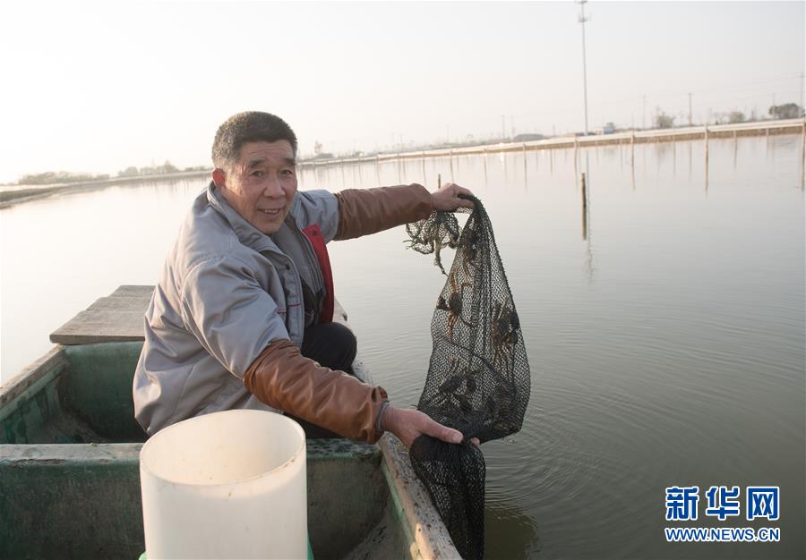 12月17日,在湖州市吳興區(qū)高新區(qū)廟港人千畝水產(chǎn)園,水產(chǎn)園負(fù)責(zé)人展示內(nèi)塘養(yǎng)殖的大閘蟹。 新華社記者翁忻旸攝