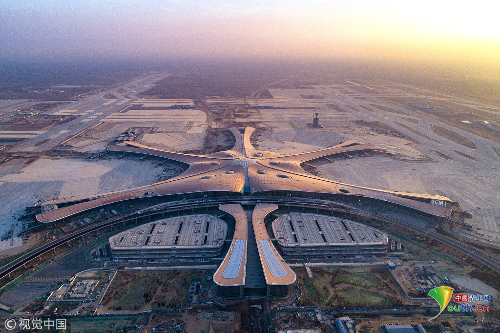 中國青年網北京12月20日電 2018年12月19日,北京大興國際機場航站樓的屋面已基本完工,一只金色“鳳凰”完整地出現在北京城南。航站樓的室內裝修在有條不紊的推進中。
