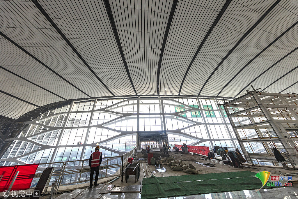 2018年12月19日,北京大興國(guó)際機(jī)場(chǎng)航站樓的室內(nèi)裝修在有條不紊的推進(jìn)中。視覺(jué)中國(guó)