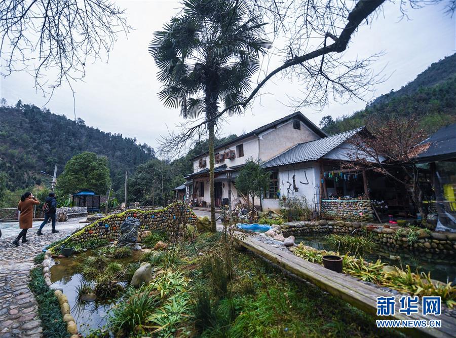 12月19日,客人走進(jìn)民宿“僻地寒樓”。該民宿共有7幢風(fēng)格各異的小屋分布在山坡上,頗具特色。河橋鎮(zhèn)青年張雁辭去了上海的工作,回到家鄉(xiāng)開辦了這家民宿。 新華社記者 徐昱 攝