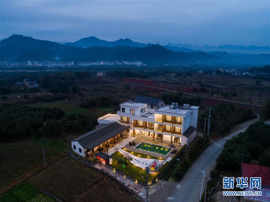 12月19日,空中俯瞰夜色中的民宿“初憶小院”(無人機拍攝)。該民宿是河橋鎮(zhèn)“90后”女孩章淑貞開辦的,民宿融入了大量的現(xiàn)代建筑設計風格,深受年輕人的喜愛。 新華社記者 徐昱 攝