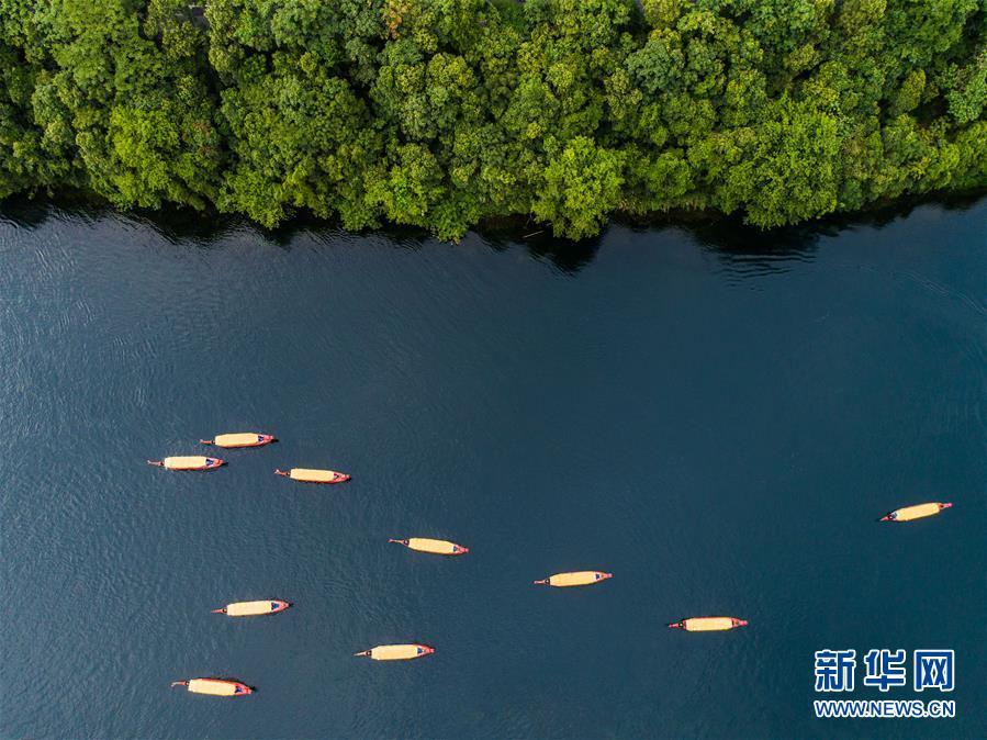 2018年7月23日,游客乘船在新安江浙江建德段江面上游玩。 大地之色,俯仰之間;壯美山河,是我的祖國。2018年,新華社記者操縱無人機“飛閱”華夏大地,在最美的時節(jié),定格下她的色彩斑斕。 新華社記者 徐昱 攝