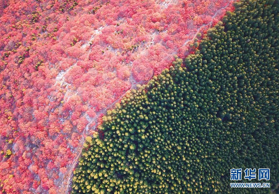 這是2018年10月31日航拍的山東濟南楔子山色彩分明的樹林。 大地之色,俯仰之間;壯美山河,是我的祖國。2018年,新華社記者操縱無人機“飛閱”華夏大地,在最美的時節(jié),定格下她的色彩斑斕。 新華社記者 朱崢 攝
