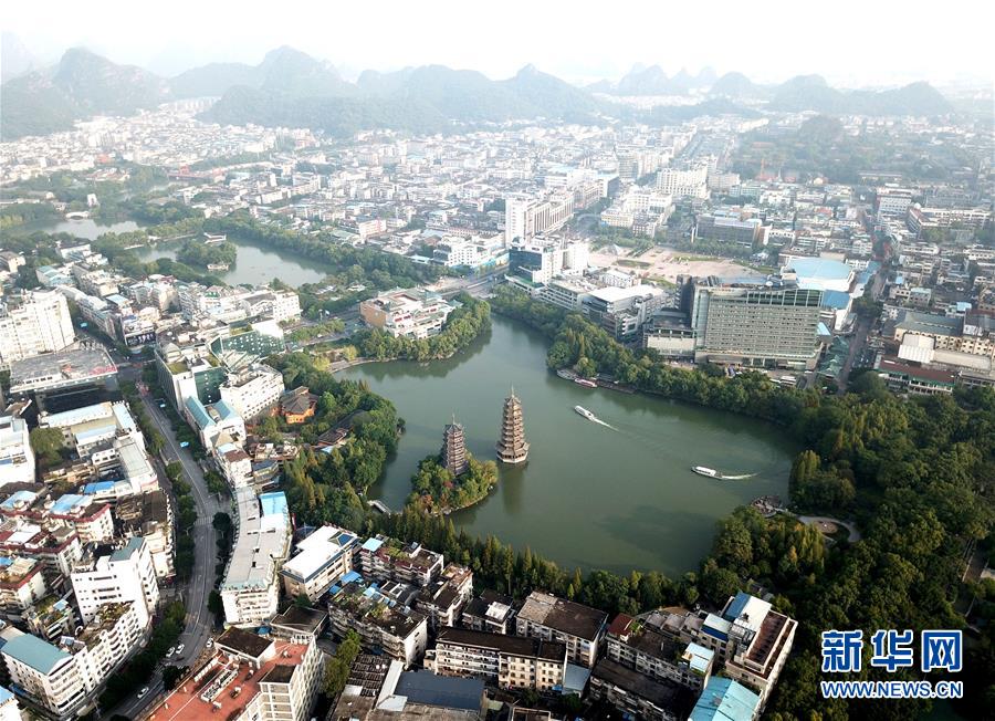 游船在廣西桂林市杉湖湖面上穿行(10月17日無人機拍攝)。 新華社記者 周華 攝