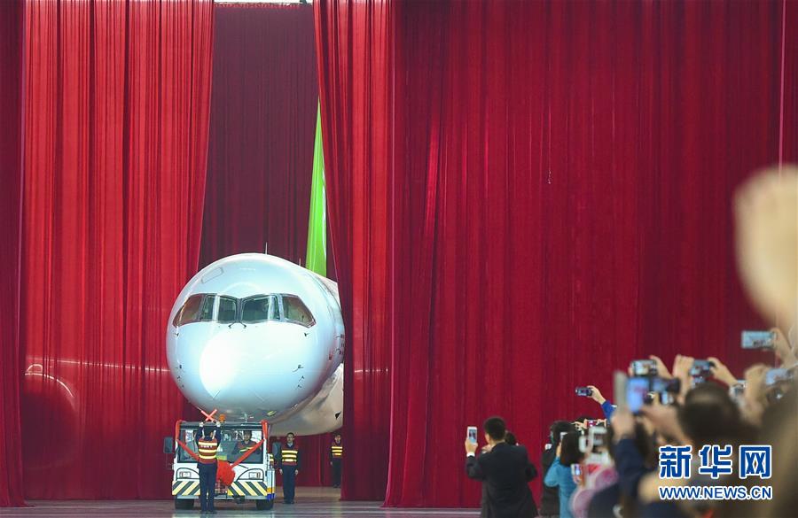 我國(guó)自主研制的C919大型客機(jī)首架機(jī),在中國(guó)商飛公司總裝制造中心浦東基地廠房?jī)?nèi)正式下線(2015年11月2日攝)。新華社發(fā)(裴鑫攝)