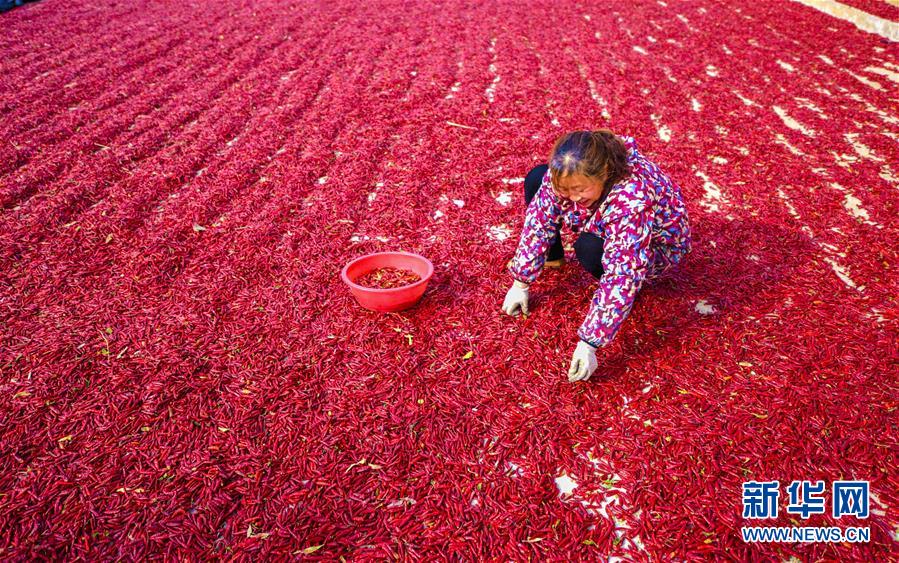 11月18日,在衡水市冀州區(qū)周村鎮(zhèn)辣椒加工交易基地,椒農(nóng)在摘辣椒。