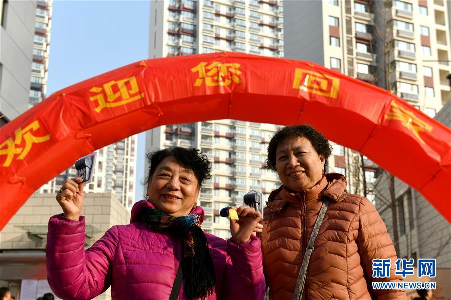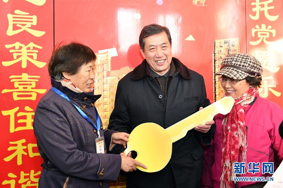 12月20日,回遷居民遲明德(中)成為和諧佳苑小區(qū)第一位辦理回遷入住的居民。 當日,濟南市槐蔭區(qū)經(jīng)十一路棚戶區(qū)改造項目——和諧佳苑小區(qū)正式交付居民回遷安居。作為濟南市槐蔭區(qū)頭號民生工程,本項目共17棟安置樓,實現(xiàn)棚戶區(qū)居民“出棚進樓”,改善安居環(huán)境。 新華社記者 郭緒雷 攝