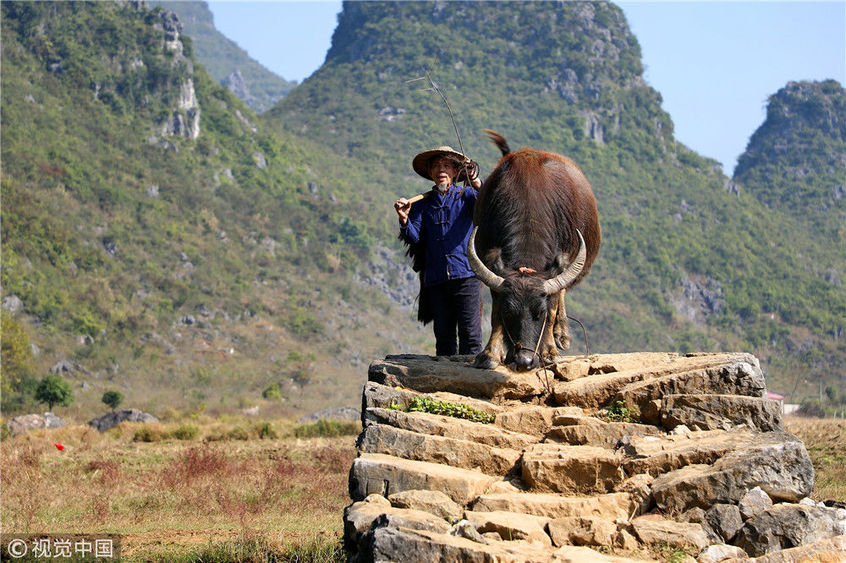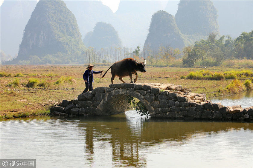 12月17日,在廣西桂林的臨桂區(qū)田心村這座叫做狀元橋的小橋上,剛吃過(guò)午飯,老許和他的水牛搭檔又要開(kāi)始一場(chǎng)生態(tài)演出了。