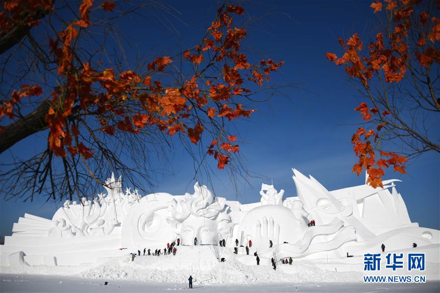 12月24日,雪雕師在制作太陽島雪博會主塑“星河之旅”。 當(dāng)日,哈爾濱太陽島雪博會主塑露出“芳容”。本屆雪博會主塑“星河之旅”長106米,高32米,寬20米,用雪量達(dá)4萬立方米。 新華社記者 王建威 攝