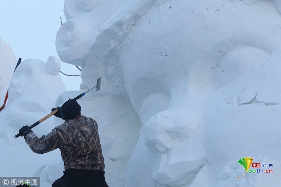 國內最大的雪雕盛會太陽島雪博會正在緊鑼密鼓建設中,部分雪雕雛形已現,雪雕師正在精雕細刻打磨中。