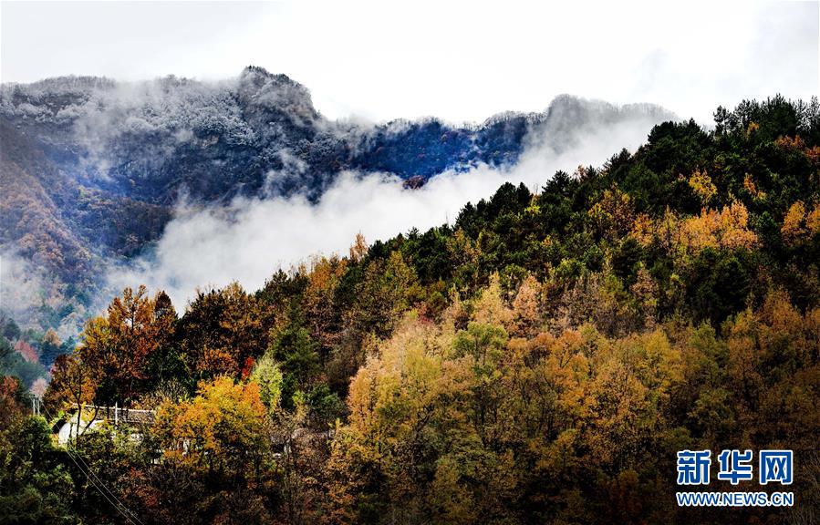 11月5日無人機拍攝的陜西省漢中市佛坪縣城旁的秦嶺景色。  新華社記者陶明攝