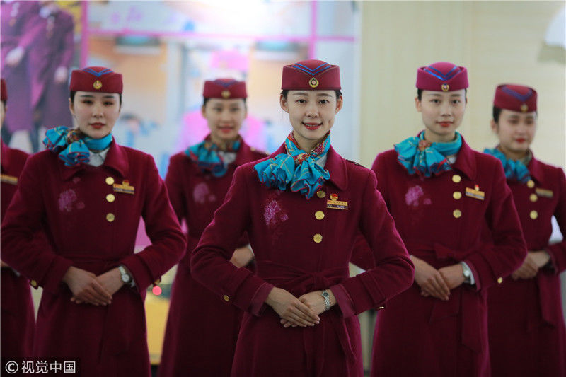 2018年12月27日,四川成都,為備戰(zhàn)即將開通的成雅鐵路,中國鐵路成都局集團(tuán)有限公司成都客運(yùn)段動(dòng)車二隊(duì)對成雅動(dòng)車的乘務(wù)人員進(jìn)行理論、形體、服務(wù)禮儀等內(nèi)容的培訓(xùn)。蘇志剛/視覺中國